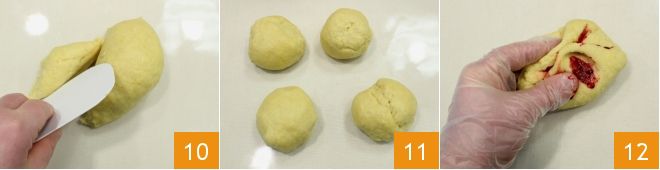 Using a spatula 10, then divide the dough into 4 balls, each weighing 150 grams 11: leave one ball white, while color the others with liquid food coloring: one red 12.