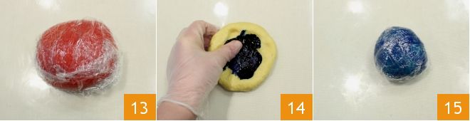 Wrap the colored dough in plastic wrap 13, then color another ball green and one blue (14-15).