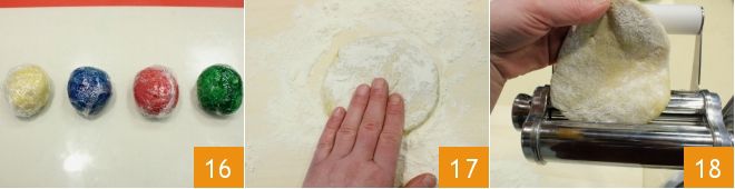 Now that all doughs are ready 16, let them rest in a cool place for at least 30 minutes. After the necessary time, you can form the masks: roll out the white dough with a little flour 17 and pass it through a pasta machine 18;