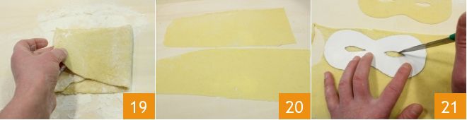 Repeat the steps with the pasta machine, folding the dough each time 19 until it is about 1/16 inch thick 20. Cut out the dough using the Carnival mask template (12-13 cm long and 6-7 cm high). Also, cut out the eyes with the tip of a sharp knife 21.