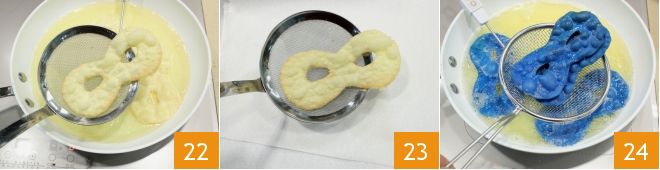 Fry the masks in plenty of seed oil for 1 minute on each side (make sure the oil does not exceed 340°F) 22, then drain them on absorbent paper 23. Then proceed in the same way with the blue dough: pass the dough through the pasta machine to roll it thin, about 1/16 inch, then cut out the masks and fry them in plenty of seed oil, then drain them 34.