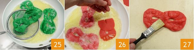 Create and cook the green 25 and red 26 masks as well. Once drained and cool, you can brush the colored masks with honey 27.