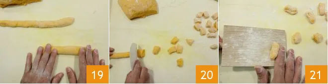 Retrieve the gnocchi dough from the fridge, divide it into pieces, and handle them to create small logs 19; with a dough scraper or the slightly floured blade of a knife, make the gnocchetti 20, to which you can give the typical grooves using a gnocchi board 21 or by passing the gnocchetti over the tines of a fork. As you make them, place the gnocchetti on a slightly floured tray.