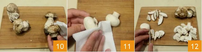 How to Clean Porcini Mushrooms by gently scraping the stem with a small knife to remove any soil, then with a cotton cloth 11; separate the mushroom caps from the stems and if they are still very dirty, quickly rinse them under a stream of cold running water. Clean the champignon mushrooms with a cotton cloth 11, rinse them briefly under running water, then cut the cleaned mushroom heads and stems into thin slices 12.