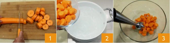 To prepare carrot gnocchetti with mixed mushrooms, start with the dough: peel the carrots with a vegetable peeler and cut the carrots into fairly thick slices 1, then boil them in a pot with slightly salted water 2. When the carrots are soft (it will take about 15 minutes), drain and let them cool. Then blend the carrots with an immersion blender 3,