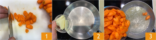 To prepare the carrots in butter and yogurt with smoked curry, first trim the carrots, peel them and cut them on the diagonal into slices about 3/16 inch thick (0.5 cm) 1; you should get about 1 lb 10 oz (750 g) of cleaned carrots. In a large skillet melt the butter 2, then add the carrots 3.
