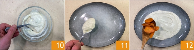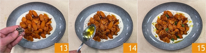 Mix well to combine 10. Spread the yogurt sauce on the base of the serving plate 11, then add the carrots 12.