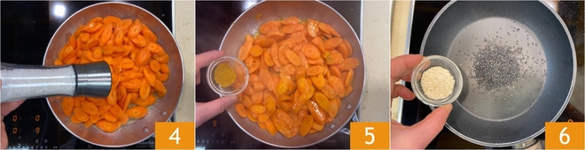 Salt 4, pepper and flavor with the smoked curry 5. Cook over medium-high heat for 10–15 minutes, stirring often. In the meantime, toast the white and black sesame seeds in a nonstick pan for about 3 minutes 6.