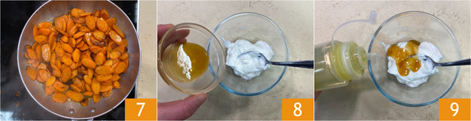When the carrots are cooked 7, prepare the yogurt sauce: put the yogurt and honey in a small bowl 8, then season with oil 9, salt and pepper.