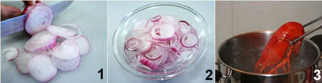 To prepare Catalan lobster, start by slicing the red onion (preferably Tropea) into thin rounds 1 and soak them in a bowl covered with water 2 and a tablespoon of vinegar for at least 20 minutes.