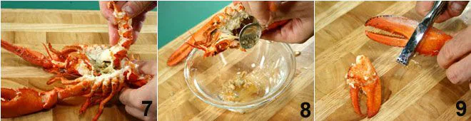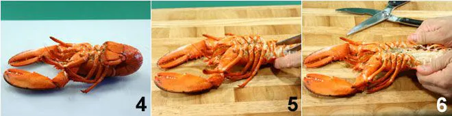 Remove the lobster from the pot and place it on a cutting board 4; using a poultry shear, cut the lobster shell 5 along the abdomen lengthwise, then spread the shell open and extract the whole meat. 6