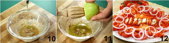 Now slice the tomatoes, season them with oil and salt and lay them out on a serving plate, place the sliced lobster meat and claws on top, garnish with the previously drained onion rings and pour the sauce made with oil, lemon, and the soft part of the lobster collected with a spoon over it. 12