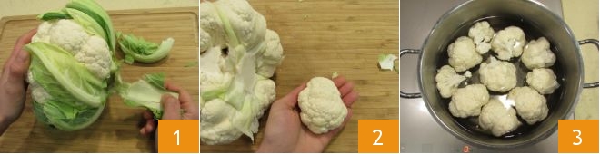 To make cauliflower and turmeric balls, first clean the cauliflower by removing the outer leaves 1 and the central stalk, then detach the florets (you will need 650 g) 2. Cook the cauliflower by placing it in plenty of cold, unsalted water; let it cook for about 25 minutes from boiling 3, or until it is completely softened.