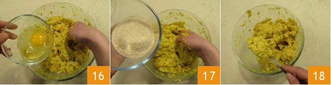 the whole egg 16 and the breadcrumbs 17, salt and mix with a fork to combine the mixture 18.