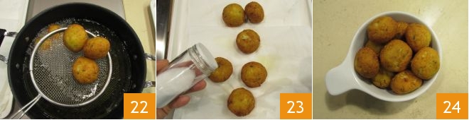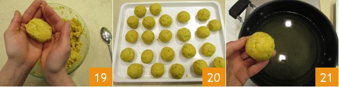 Now you can shape the balls: take about 2 oz of mixture and work it with your hands to form balls 19, as you shape them, place them on a tray 20. In a pan, heat the seed oil and when it reaches a temperature of about 340°F, you can immerse the balls 21 and cook until they are golden, which will take about 5 minutes.