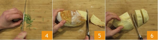 Now chop the rosemary needles with a knife 4, remove the crust from the loaf 5, and cut the crumb into pieces 6, you will need to obtain 95 g of crumb.