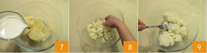 Soak the crumb in milk 7 and work it with your hands until it is completely soft 8. When the cauliflower is cooked, drain it well and transfer it to a bowl, then mash it with a fork 9