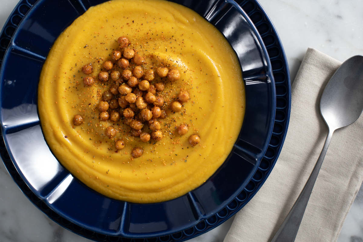 The velvety cauliflower and turmeric soup with crispy chickpeas is a first course that will conquer you at the first taste, thanks to the warm and aromatic flavors of the spices we have chosen to enrich this autumn dish. As soon as the air starts to get crisper, the desire for an comfort food like this delicious cream soup grows, enhancing the best vegetables of this season. Here you will find cauliflower, whose strong flavor will be softened by the pumpkin, the undisputed star of the autumn table. Giving this dish a truly special touch will be the crispy chickpeas roasted in the oven with a mix of turmeric and black pepper that will tantalize the palate!