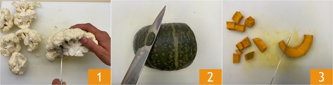 To prepare the velvety cauliflower and turmeric soup with crispy chickpeas, clean the cauliflower, obtaining the florets 1. Cut the pumpkin into wedges, peel it 2, remove the seeds and internal filaments, and then cut it into cubes of about 3/4 inch 3.