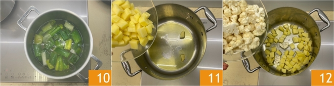 Simmer for twenty minutes 10. In a large pot, heat the oil, add the potatoes 11 and the cauliflower 12, and sauté for about 5 minutes.
