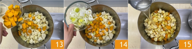 Add the pumpkin 3 and the leek 14, sauté everything together, after 5 minutes season with salt, and pour in the leek broth 15.