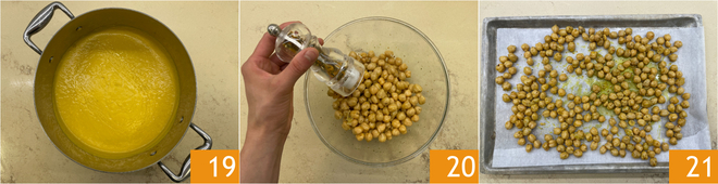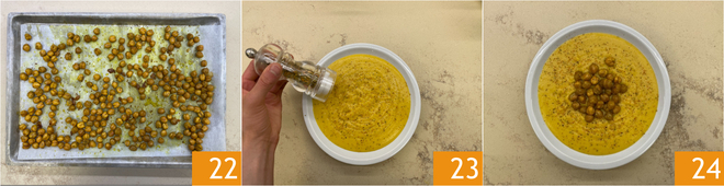 You should obtain a smooth cream 19. Meanwhile, in a bowl, season the drained chickpeas with black pepper, turmeric 20, and salt. Transfer them to a baking tray lined with parchment paper 21, roast in a preheated fan oven at 390°F for 20 minutes.