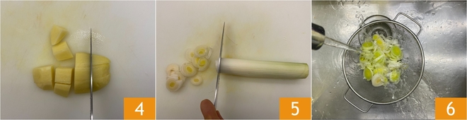 Peel the potatoes and cut them into cubes of about 3/4 inch 4. Clean the leeks, keeping aside the green part, then slice them 5, rinse them under running water 3, and drain them.