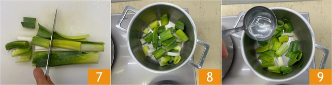 Cut the green part of the leeks into pieces 7, rinse them, toast them in a pot with a little oil for a few minutes 8, add 2 cups of water 9.