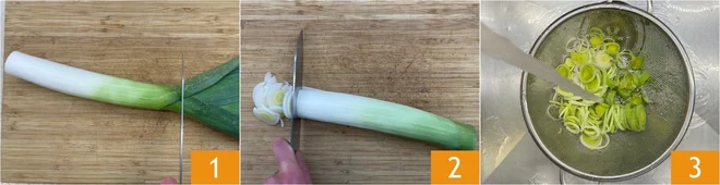 To make the cauliflower soup, first clean the leek: remove the base and green leaves 1, then remove the outer layer and cut it into rings 2. Rinse the leek under running water 3.
