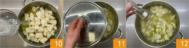 Pour in the water 10 and cook with the lid on for about 20 minutes or until the cauliflower and potatoes are soft 11; check the consistency by piercing them with a fork. After the cooking time, salt and pepper 12.