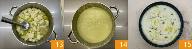 Turn off the heat and blend with an immersion blender 13 to obtain a smooth and homogeneous cream 14. Serve your cauliflower soup hot, garnished with a drizzle of oil, some thyme leaves, and a grind of pepper 15!