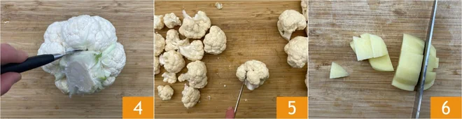 Move on to the cauliflower: remove the stem 4 and separate the florets 5; you will need about 27.5 oz of florets. Finally, peel the potatoes and cut them into cubes 6.