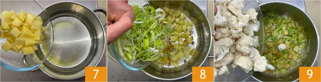 In a large pot, heat a dash of oil, then add the potatoes 7 and the leek 8. Let them brown for 5 minutes, stirring occasionally, then add the cauliflower 9.