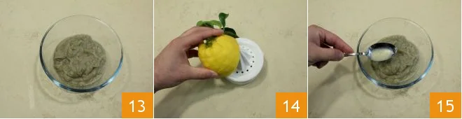 Transfer everything into a small bowl 13, then squeeze the juice of half a lemon 14 and add it to the puree you obtained 15.