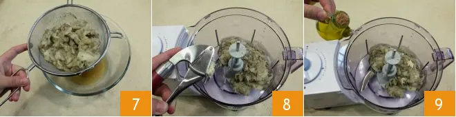 so that it releases the excess liquid 7 (alternatively, you can also use a cotton or linen cloth). Put the flesh in a food processor equipped with blades and add the crushed garlic 8 and the oil 9.