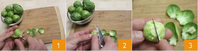To prepare braised Brussels sprouts with beer, first remove the outer leaves from the sprouts 1, trim off the protruding bottom part 2, and cut a cross into them with a small knife 3.