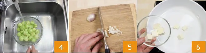 Wash the sprouts thoroughly under running water 4 and let them drain. Peel and chop the shallot 5, then sauté it in a non-stick pan with the butter 6.
