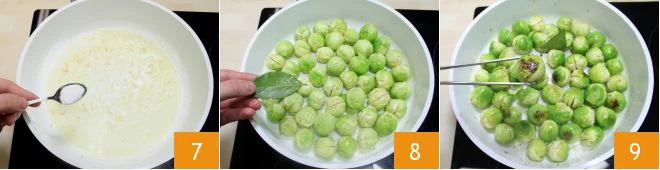 Once the shallot is well browned, add the sugar 7 and immediately after, add a bay leaf to the sprouts 8 and sauté them over high heat for 5 minutes until they are well braised 9.
