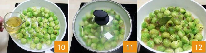 Deglaze the sprouts with beer 10 and let it evaporate for 3 minutes. Salt and pepper, cover with a lid, lower the heat, and let cook for about ten minutes 11. Remove the lid, increase the heat, and cook for another 5 minutes, stirring occasionally to prevent the sprouts from sticking to the bottom 12. The braised Brussels sprouts with beer are ready!