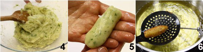 mix well until you get a homogeneous mixture 4; grease your hands with olive oil, then take a small amount of mixture (you should get a croquette the size of a middle finger) and form a cazzillo 5, which you will place on a tray. Continue this way until you finish the dough. Fry the cazzilli in extra virgin olive oil (or peanut oil) at about 350°F-355°F (never exceed 355°F). Start frying by testing with a single cazzillo 6: if it opens or absorbs too much oil remaining soft inside, you’ll need to add 2-3 tablespoons of flour, even though the original recipe does not require it, because Sicilian fry shops use a particular type of potato that does not require this addition. Fry all the cazzilli and serve them immediately!