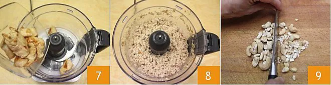 When the turkey bites are cooked, transfer them to a mixer 7, blend for a few seconds until the meat is well chopped 8, and then transfer the blended mixture into a large bowl. You can also carry out this process with a knife if you don't have a mixer. At this point, place the cashews on a cutting board and coarsely chop them 9.