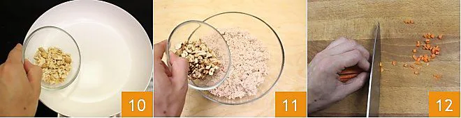 Sauté the chopped cashews in a non-stick pan and toast them for a few minutes until they are crispy and darker 10. Then add the toasted cashews to the chopped turkey bites 11. Next, take a carrot, peel it, and cut it in half. Then slice it into very small cubes 12.