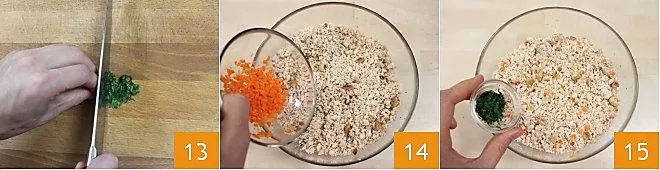 Also wash the parsley under running water and finely chop it on a cutting board 13. At this point, add the diced carrot 14 and the chopped parsley to the mixture 15.