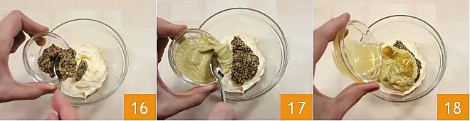 Now prepare the mustard sauce: transfer the mayonnaise into a small bowl and in order add Dijon mustard 16, delicate mustard 17, and honey 18. Mix everything until you get a rather light sauce characterized by the dark grains of Dijon mustard.