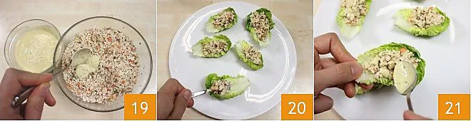 Once the mustard sauce is prepared, add half of it to the turkey, carrot, and parsley mixture 19 and mix until a rather compact consistency is achieved. Now carefully wash the baby lettuce and separate the leaves, placing the crunchiest and most curved ones on a serving plate. Then proceed to fill them with the mixture 20. Your lettuce cups with turkey salad are ready to be served. Season them with more mustard sauce to make them even more delicious 21!