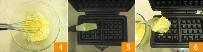 Mix everything with the whisk 4. At this point, heat a waffle iron to a medium-high temperature and brush both sides with melted butter or oil 5, then pour in the mixture using a spoon 6.