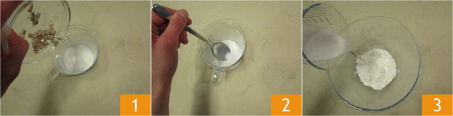 Prepare the starter dough: dissolve the yeast in lukewarm milk (we recommend not exceeding 86°F) 1 and stir 2, then immediately pour the mixture into a bowl with 100 g of flour 3.