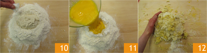 Place the starter dough in the center and distribute the lard in small pieces all around 10. Also, pour the eggs in the center 11, start kneading with a fork or with your hands to prevent the mixture from leaking out 12.