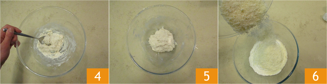 Mix quickly with a spoon 4 or with your hands until all the flour is absorbed. Once ready 5, cover with plastic wrap and let the starter dough rise for about 2 hours in a warm place; it should double in volume. Half an hour before the end of the rising, start weighing the lard and leave it at room temperature to soften. When the starter dough is ready, pour 400 g of flour into a bowl, then add the grated cheeses: Parmigiano Reggiano PDO and Pecorino Romano 6.