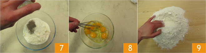 Season with 2 teaspoons of ground pepper 7 and mix. Crack the eggs into a bowl and beat them lightly 8. On the work surface, pour the mixture of flour, cheeses, and pepper and create a well 9.